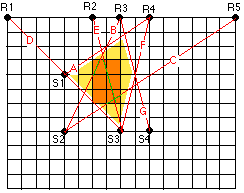 c) la zone où peut se trouver la perturbation est en jaune puisqu'elle n'affecte que les rais B, C et E et non les autres rais qui doivent donc se trouver en dehors de la zone. En orange la zone rectangulaire la plus probable. d) la zone perturbée présente donc des vitesses trop lentes puisque le retard est postif (l'onde sismique met plus de temps à se propager). e) détermination graphique (voir tableau ci-dessus). f) dv = -0,8 km.s-1 g) les zones chaudes correspondant à un ralentissement des ondes sismiques, nous sommes en présence d'une zone chaude si la perturbation de la vitesse n'est due qu'à une différence de température, si les trajets sont rectilignes (si le milieu est homogène pour tous les autres paramètres que la température)... etc. |