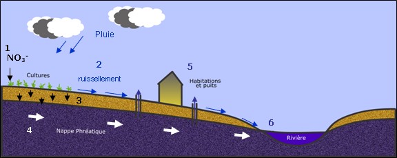 ions nitrate (N03-). 2. Ruissellement. 3. Infiltration dans le sol et le