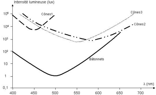 Pour réaliser le graphique ci dessous, les photorécepteurs ont été exposés à des longueurs d'ondes différentes. Pour chaque longueur d'onde, le photorécepteur a été soumis d'abord à une intensité lumineuse très faible, puis de plus en plus forte (mesurée en lux). Le graphique représente l'intensité lumineuse minimale pour laquelle le photorécepteur réagit.