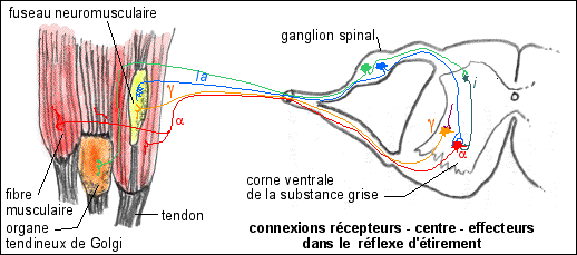 Lors d'un réflexe d'étirement et pour qu'il y ait mouvement réflexe, les muscles antagonistes des muscles étirés qui se contractent doivent aussi se relâcher. Cette inhibition des muscles antagonistes serait due à une innervation réciproque à partir des motoneurones alpha. Les fibres sensitives en liaison avec les fuseaux neuromusculaires établiraient une liaison directe avec les motoneurones alpha contrôlant la contraction du muscle étiré et une liaison indirecte par l'intermédiaire d'interneurones inhibiteurs avec les motoneurones innervant les muscles antagonistes. |