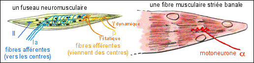 Le fuseau neuromusculaire, récepteur à l'étirement comprend 2 à 10 fibres musculaires modifiées (peu striées) encapsulées (capsule conjonctive) attachées aux membranes complexes (aponévroses) cloisonnant le muscle. Deux types de fibres fusoriales se rencontrent: 2 à 3 fibres à "bague nucléaire" dont la partie centrale est renflée et 3 à 5 fibres "à chaîne nucléaire" présentant une zone allongée où sont condensés les noyaux. ![]() D'après Précis de physiologie, Calas et al., 1997, Doin, fig 10.19 p 341 |