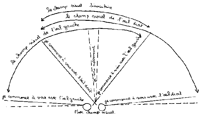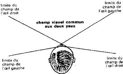 Au terme de ces essais, un bilan est établi d'appeler champ visuel toute la partie de l'espace visible dans une position donnée, le regard étant immobile. Chaque il a son champ visuel, plus étendu vers le bord externe que 8u côté du nez, plus vaste vers le bas que vers le haut, plus large dans le sens horizontal que dans le sens vertical.